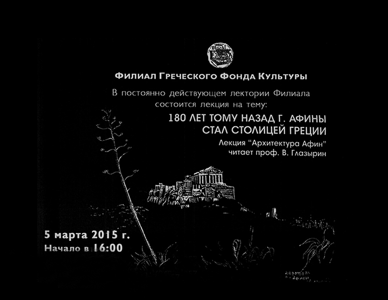 В постоянно действующем лектории Греческого Фонда Культуры 5 марта 2015 года в 16:00 состоится лекция на тему: “Архитектура Афин. К 180-летию столицы”. Вход свободный. Лектор: В. Глазырин, профессор ОГАСА, […]